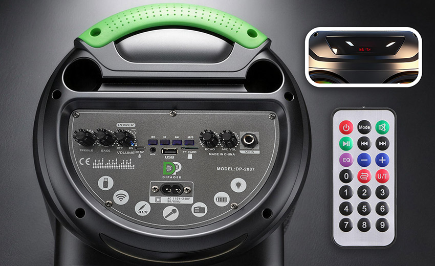 LED数显屏,实时显示歌曲信息;配备多功能红外遥控器,可远程控制播放、切换曲目、灯光模式等。