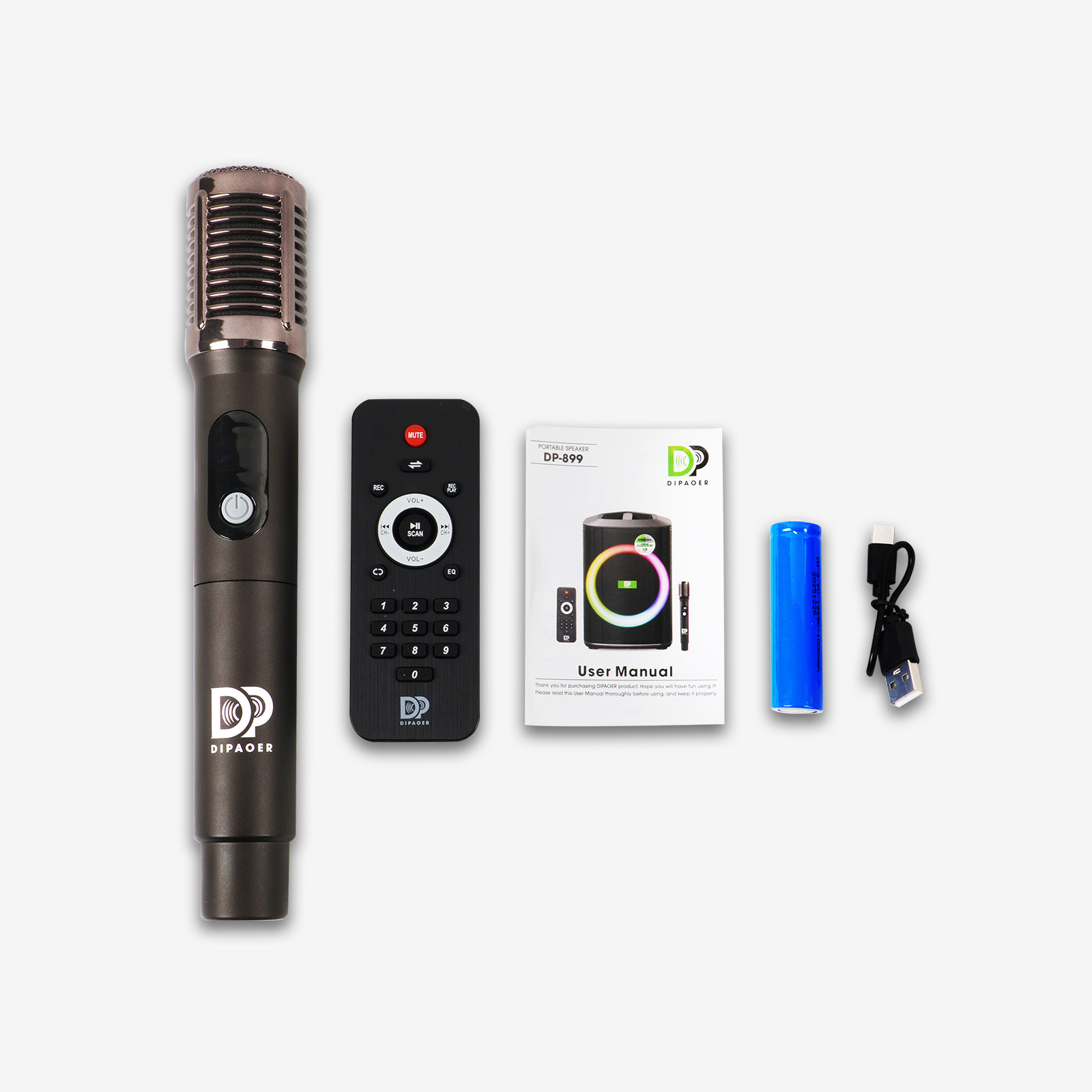附赠一支无线麦克风,内置18650锂电池。机身自带专属收纳位。