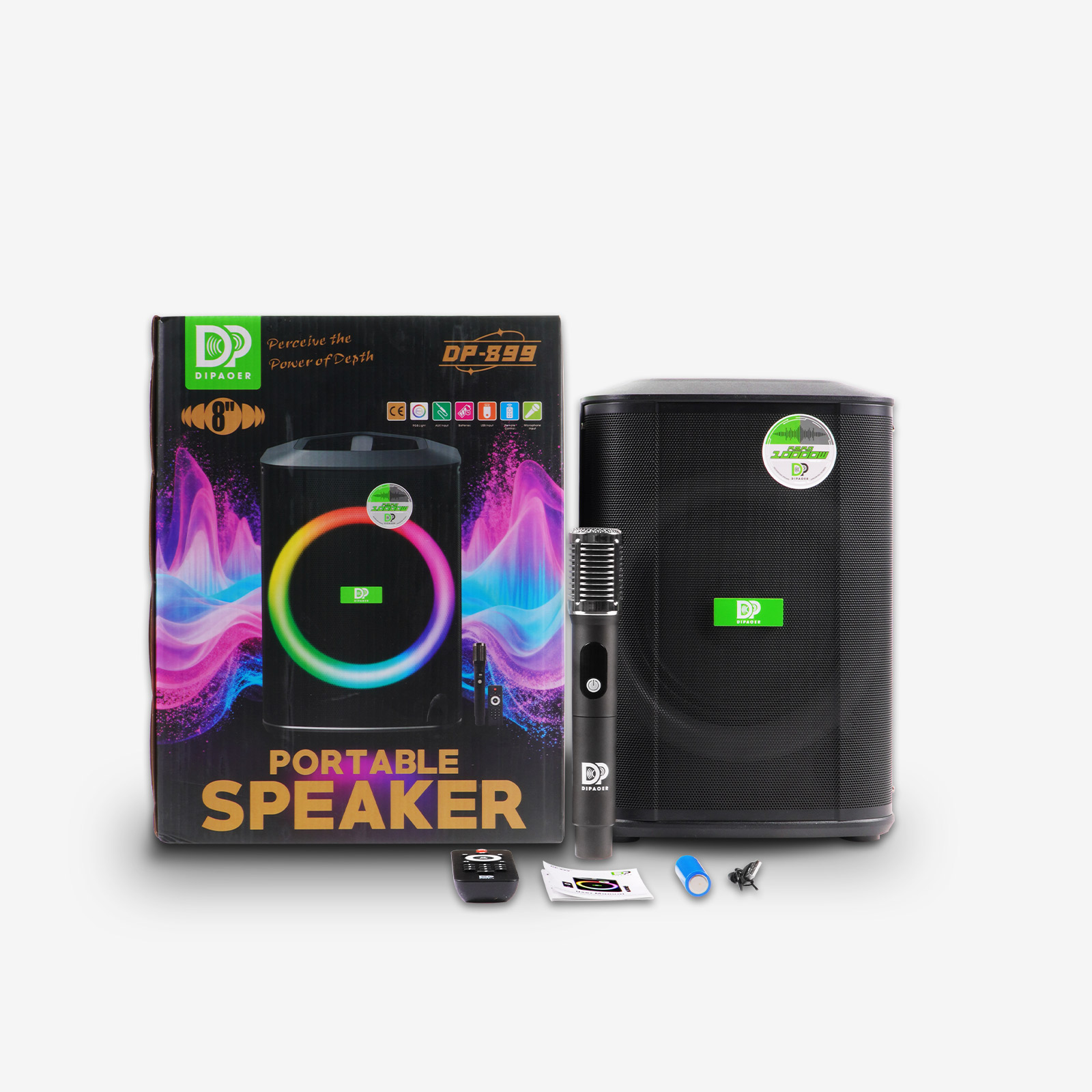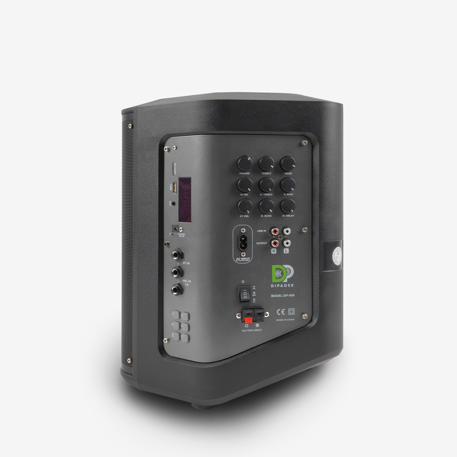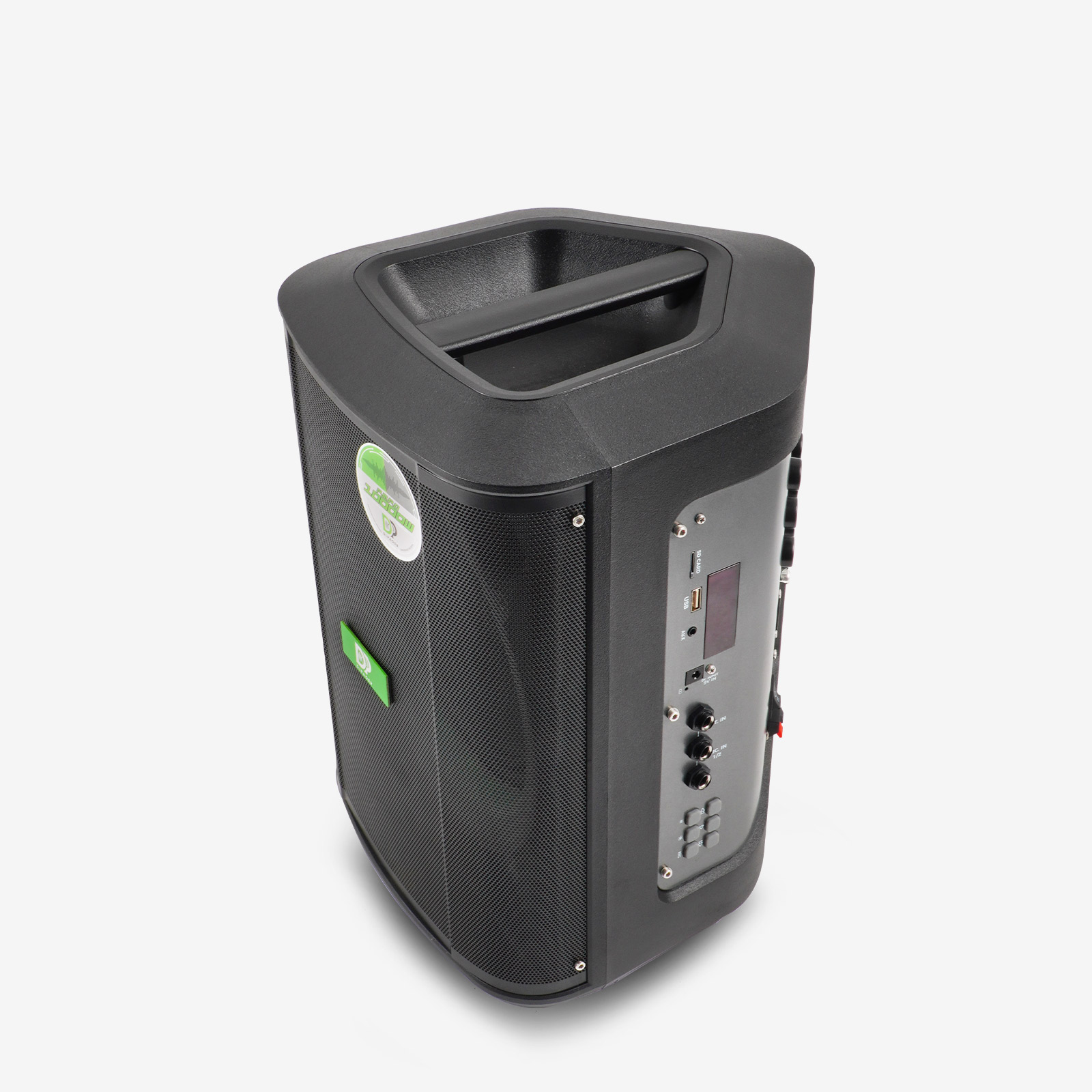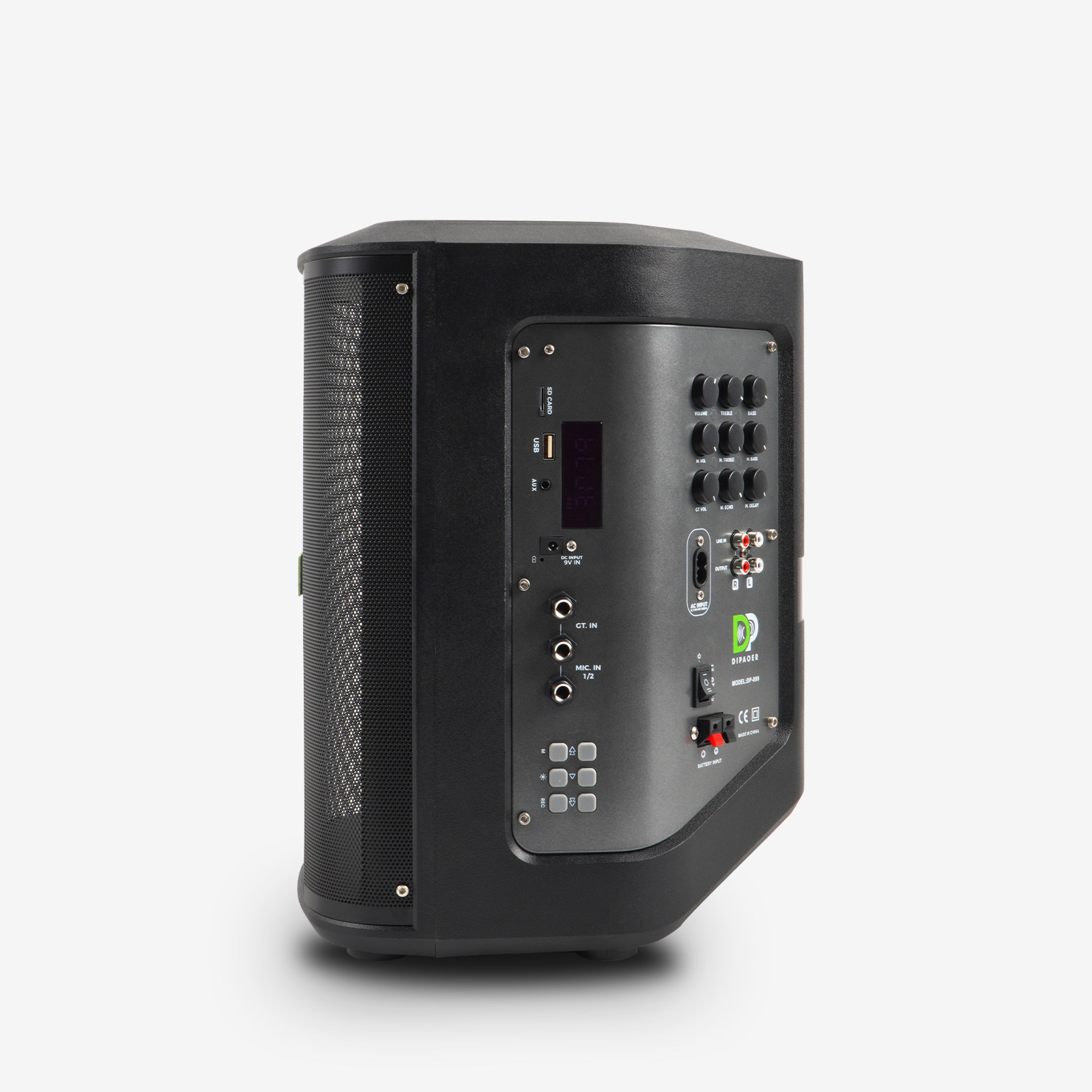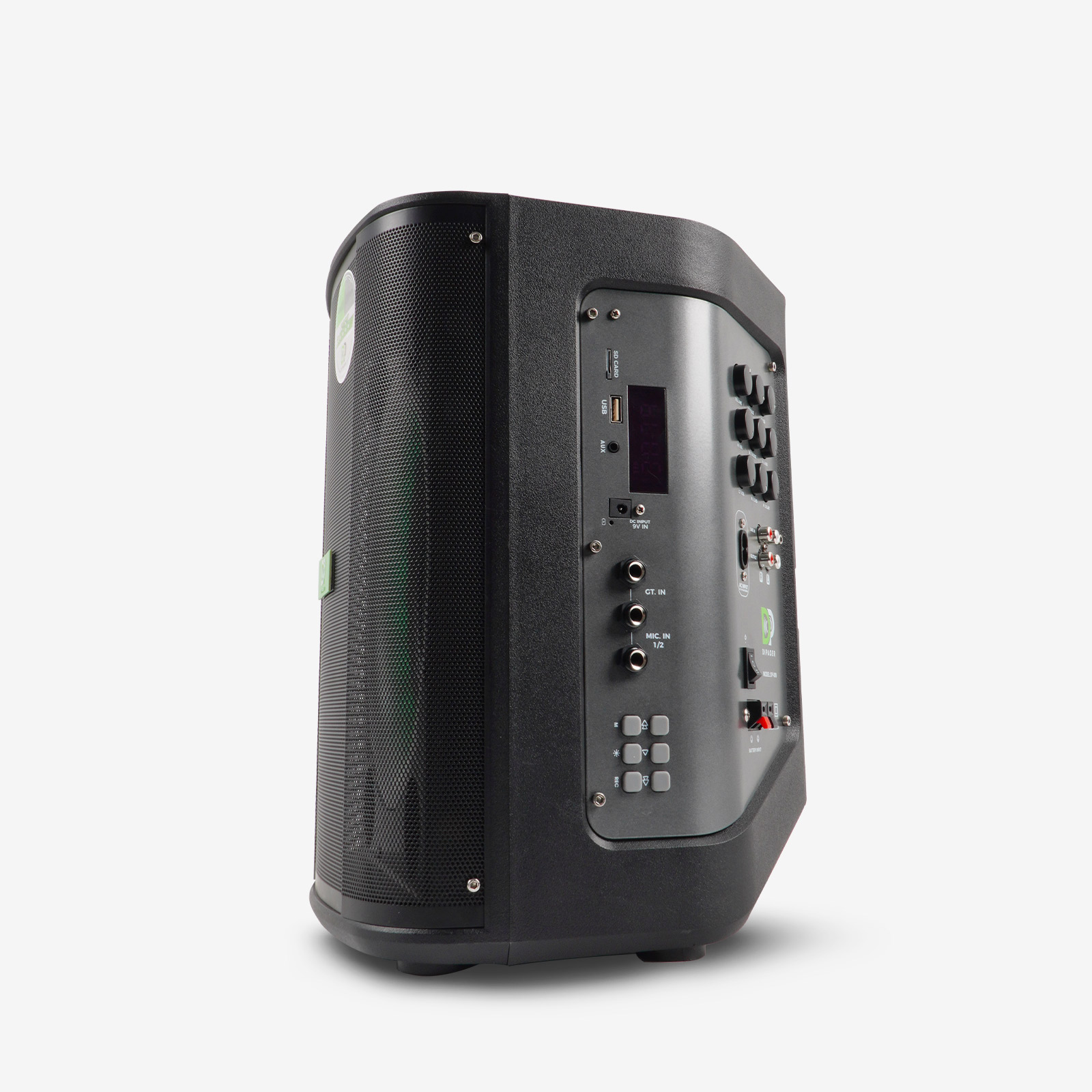 LED数显屏,实时显示电量、歌曲信息;配备多功能红外遥控器,可远程控制播放、切换曲目、灯光模式等;内置一键高清录音功能。