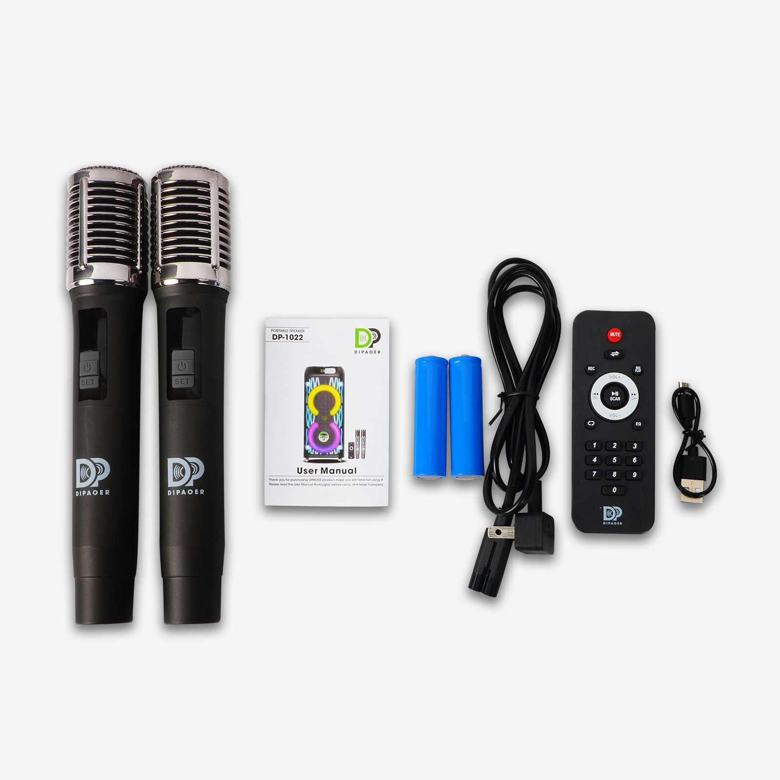 附赠两支可充电无线麦克风,内置18650锂电池。
